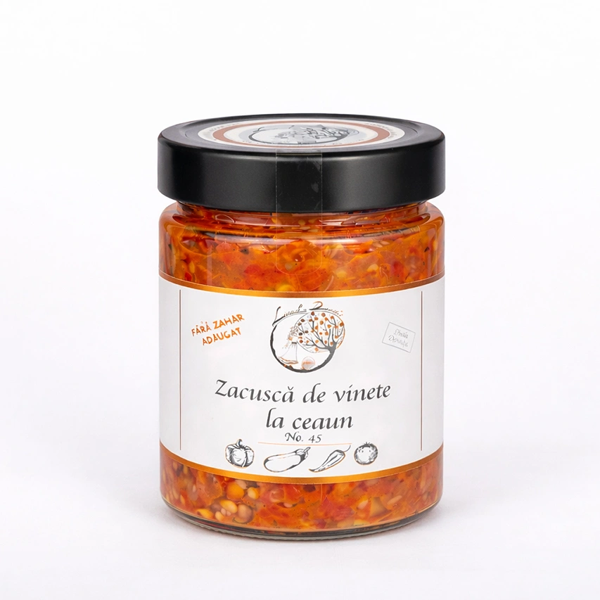 Zacusca de vinete de la Livada Domniței este un preparat tradițional, realizat din legume atent selecționate și gătite lent, pentru a obține un gust bogat și bine echilibrat. Vinetele se îmbină armonios cu ardei copți, ceapă și suc de roșii, rezultând o zacuscă fină, aromată și plină de savoare. Este potrivită ca aperitiv, pe pâine proaspătă sau prăjită, dar și ca garnitură, atunci când îți dorești un produs autentic și consistent.